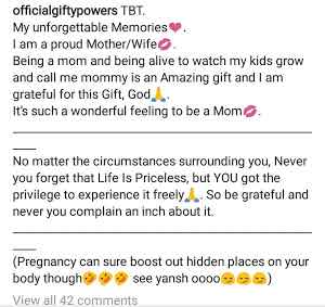 Gifty, who denied reports that she was pregnant back in 2017, has finally begun sharing photos of her pregnant belly after she introduced her daughter to the world.