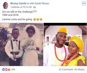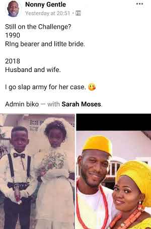 A boy and a girl who served in a bridal party years ago as a ring bearer and little bride respectively have gone on to become husband and wife 28 years later.