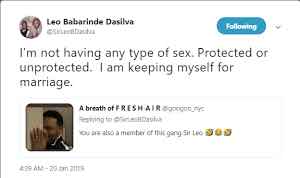 Big Brother Naija star, Leo Dasilva has declared he’s abstaining from sex until he gets married.