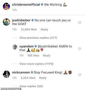 After Chris Brown shared a video of himself dancing, and captioned it ‘we working’, Bieber wrote: ‘No one can touch you ur the GOAT.’
