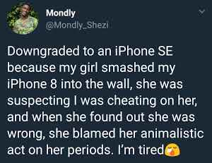 Celebrity Woman smashed her boyfriend’s phone and blamed her behavior on her period Date: January 23, 2019Author: Abu destiny 0 Comments As seen on Twitter Share this story Share this:Tweet Share on WhatsApp (Opens in new window) WhatsApp Share on Telegram (Opens in new window) Telegram Print (Opens in new window) Print Like Loading... Related