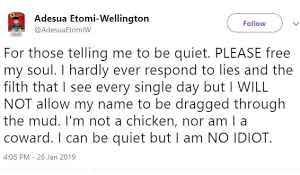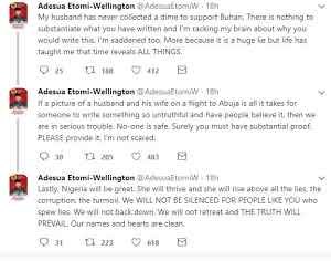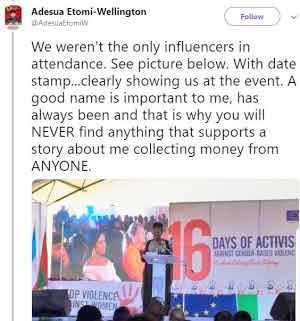 According to Adesua, ‘Miriam, I don’t know u and I will never understand why you have tweeted this lie. My husband and I went to Abuja in December for the 16 days of Activism against gender based violence. A final event was put together by the EU and as influencers, we were invited to attend’.