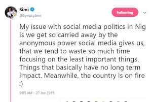 According to her, ‘my issue with social media politics in Nigeria is we get so carried away by the anonymous power social media gives us, that we tend to waste so much time focusing on the least important things. Things that basically have no long term impact’.