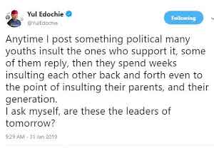 Celebrity Are these the leaders of tomorrow? – Yul Edochie tackles Nigerian youths Date: January 31, 2019Author: Abu destiny 0 Comments As tweeted by the Nollywood actor cum politician. Share this story Share this:Tweet Share on WhatsApp (Opens in new window) WhatsApp Share on Telegram (Opens in new window) Telegram Print (Opens in new window) Print Like Loading... Related