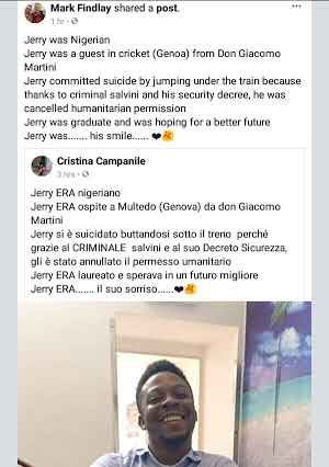 A 25-year-old Nigerian man, Prince Jerry, committed suicide on January 28 2019, by jumping under a train in Tortona, Genoa, Italy after his request for a residency permit for humanitarian reasons was rejected, Monsignor Giacomo Martino, the head of association Migrants, said on Thursday.