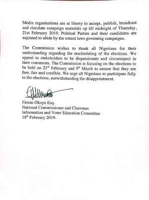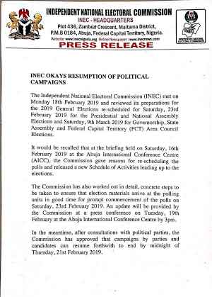 Following the postponement of the elections, the Independent National Electoral Commission (INEC) says political parties can resume their campaigns. The commission gave the directive in a statement released this evening.
