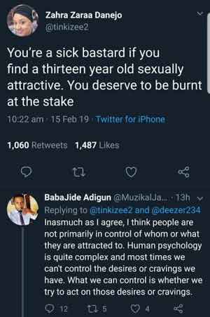 Male Twitter users have warned a lady and asked her to take her post down after she criticized men who are attracted to 13-year-old girls.