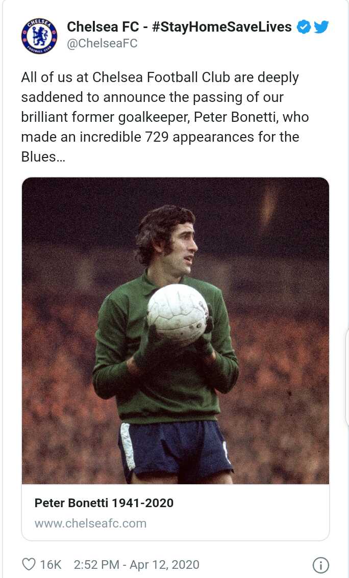 “Chelsea Football Club is hugely saddened to announce the passing today of one of our indisputably all-time great players, Peter Bonetti.