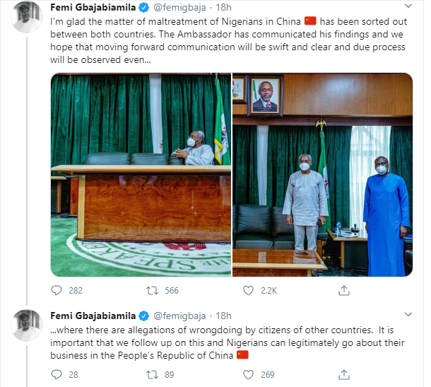Femi Gbajabiamila, Speaker of the House of Representatives has said that the maltreatment of Nigerians in China has been resolved between both countries.